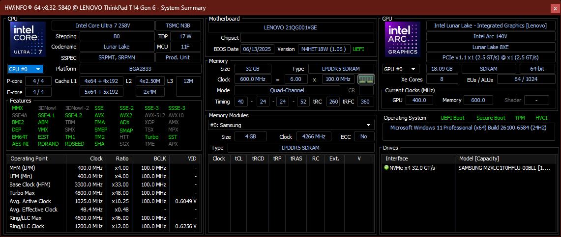 | Lenovo ThinkPad T14 Gen 6 21QG001VGE Intel Core Ultra 7 258V ⎘ Intel Arc Graphics 140V ⎘ 32 GB Pamięć, 1024 GB SSD | Amazon: $2,097.95 Cena katalogowa: 1960 Euro | 1.5 kg | 22 mm | 14.00" 1920x1200 162 PPI IPS LED | |