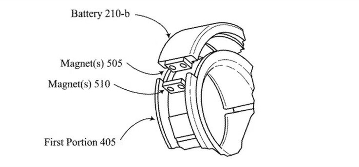 Jak pokazano na ilustracjach, bateria znajduje się w jednej połowie pierścienia. Zewnętrzną część, w której znajduje się bateria, można łatwo wyjąć i wymienić w razie potrzeby. Zarówno moduł baterii, jak i pierścień zawierają małe magnesy, które utrzymują baterię na miejscu. Metalowe styki umożliwiają przesyłanie prądu z baterii do pierścienia, dzięki czemu użytkownicy nie muszą majstrować przy małych wtyczkach, aby wymienić baterię.