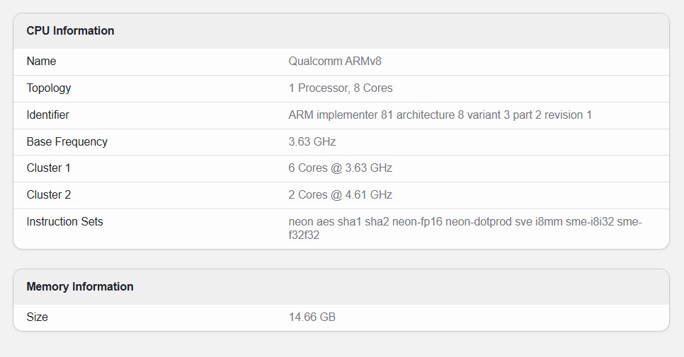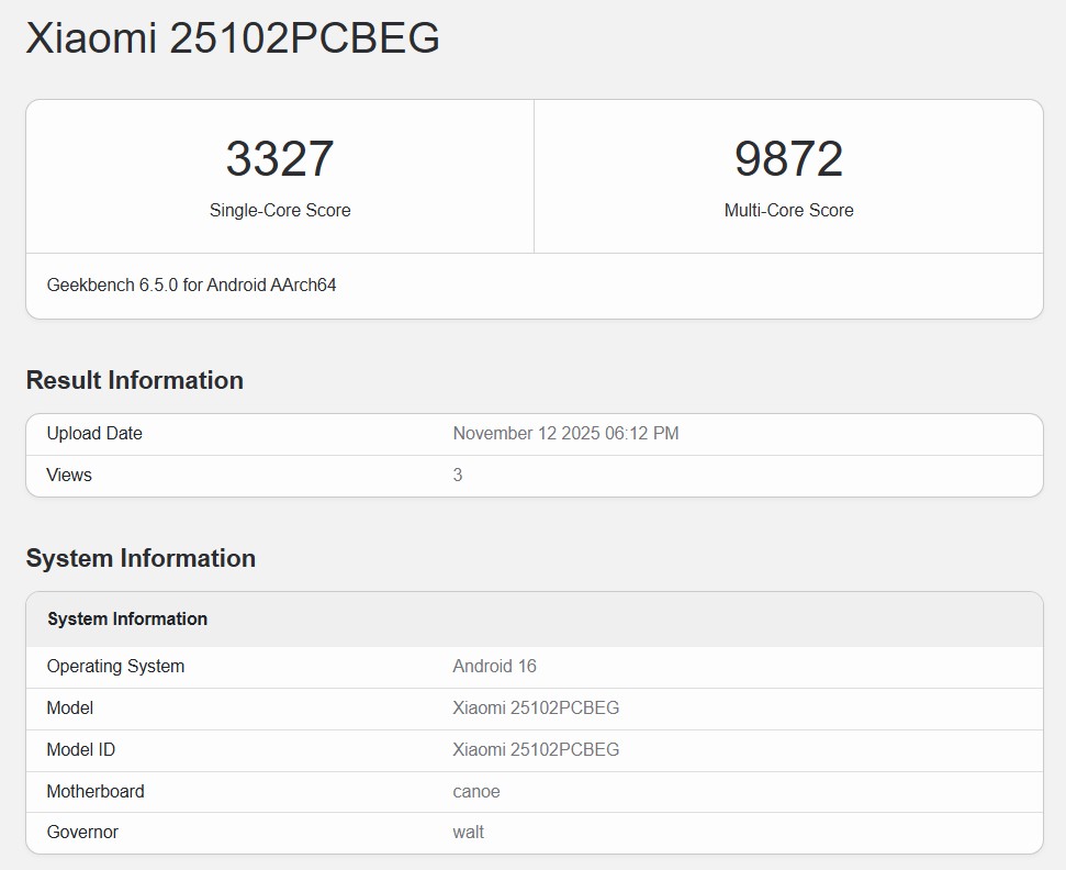 POCO F8 Ultra pojawił się w bazie danych Geekbench 6, uzyskując wyniki 3,327 w testach jednordzeniowych i 9,872 w testach wielordzeniowych. Zagłębiając się w szczegóły, nazwa kodowa płyty głównej "canoe" i częstotliwości taktowania procesora (4,61 GHz dla dwóch głównych rdzeni i 3,63 GHz dla pozostałych sześciu) potwierdzają, że urządzenie będzie mogło pochwalić się potężnym Snapdragon 8 Elite Gen 5.