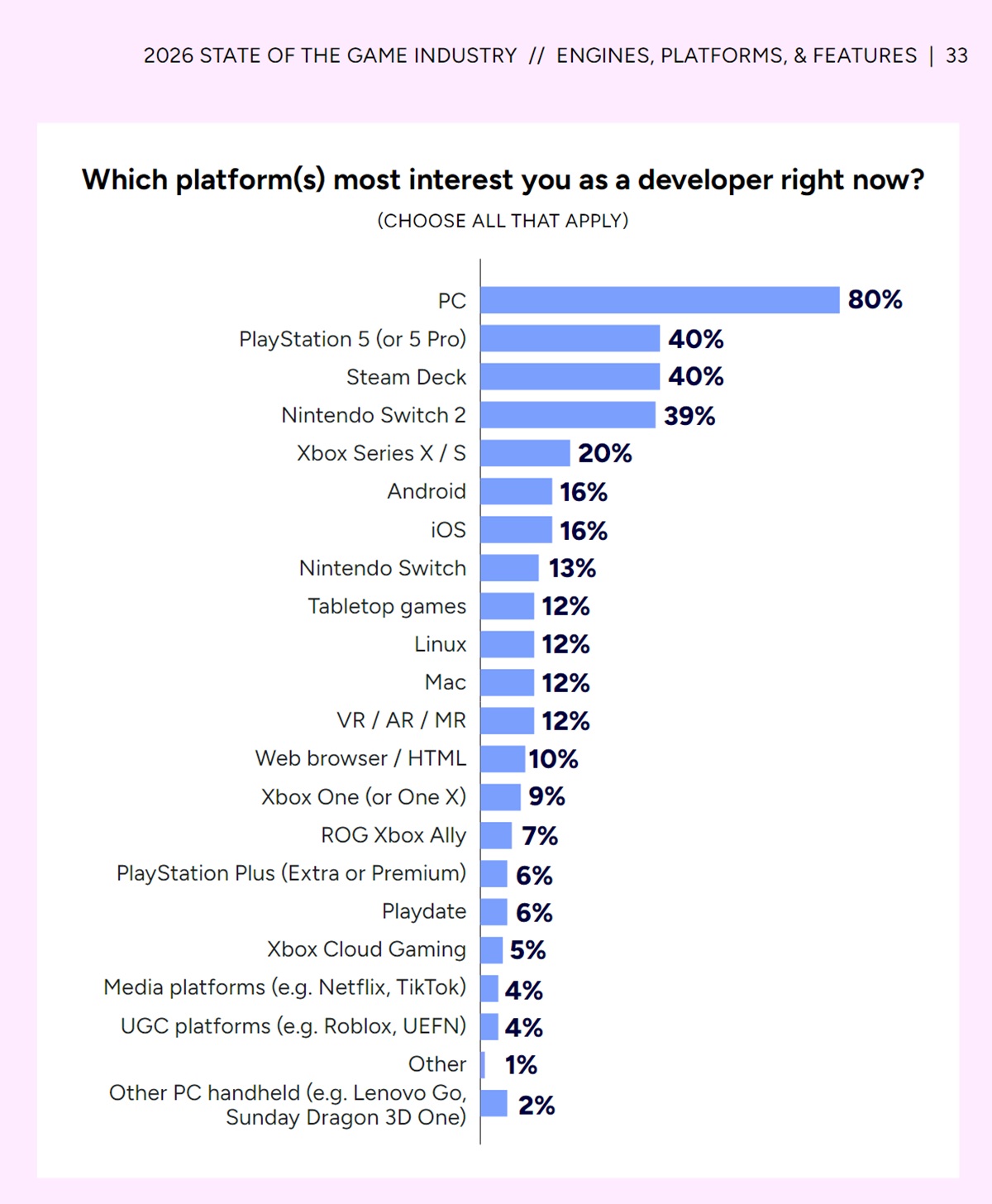 Jak podaje Video Games Chronicle ponad 2300 profesjonalistów z branży gier wzięło udział w konferencji GDC gDC. Jedno z pytań brzmiało: "Która platforma (platformy) najbardziej interesuje Pana/Panią jako dewelopera?" Ponieważ respondenci mogli wybrać wiele opcji, na poziomie 80%, PC był zdecydowanym zwycięzcą. PS5 i Steam Deck uplasowały się na poziomie 40%, Switch 2 na poziomie 39%, a Xbox Series X|S na poziomie 20%.