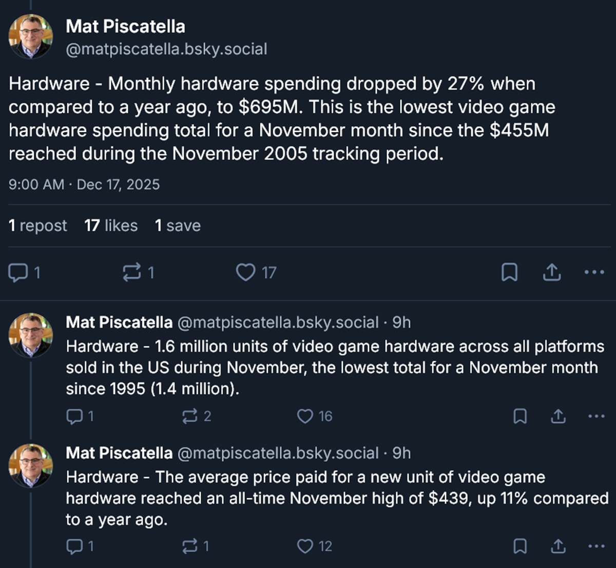 Sony może świętować raport Circana, ale istnieją znaki ostrzegawcze dla rynku sprzętu. Całkowita sprzedaż spadła o 27% w porównaniu do tego samego okresu w 2024 roku. Wydatki wyniosły 695 milionów dolarów, co stanowi najniższy listopadowy wynik od 2005 roku. Sprzedawcy detaliczni sprzedali 1,6 miliona sztuk, co było najgorszym wynikiem od listopada 1995 roku.