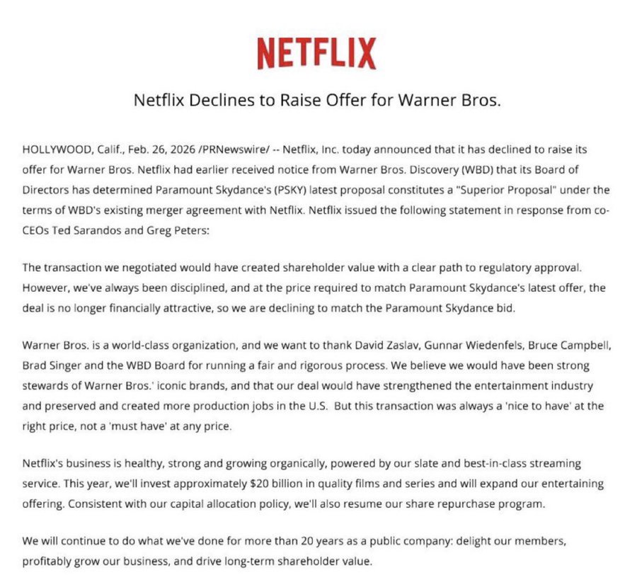 W dniu 5 grudnia 2025 r, Netflix opublikował oficjalny komunikat, zgodnie z którym platforma streamingowa w pełni wynegocjowała i sfinansowała ostateczną umowę nabycia Warner Bros. wraz z jej studiami filmowymi i telewizyjnymi, HBO Max i HBO. Transakcja gotówkowa i akcyjna została wyceniona na 82,7 mld USD (wartość kapitałowa 72 mld USD). Jednak w rzeczywistości nie była to ostateczna umowa, ponieważ przetarg na WBD pozostał otwarty, a Paramount Skydance nadal składał oferty w międzyczasie. 26 lutego zarząd Warner Bros. Discovery uznał najnowszą ofertę Paramount za "lepszą" od pierwotnej umowy z Netflix. Ta wyższa oferta oznaczałaby, że Paramount Skydance nabyłby 100% WBD za około 111 miliardów dolarów. Netflix odmówił złożenia wyższej oferty, a Paramount wygląda teraz na gotowego do całkowitego przejęcia WBD.