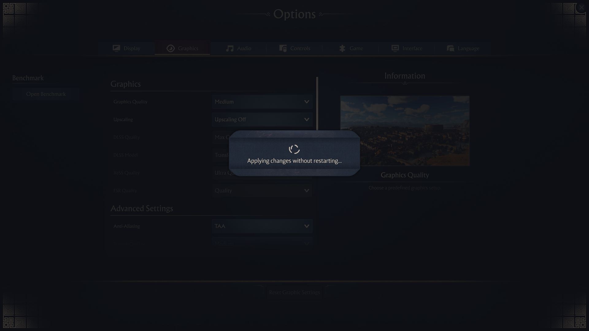 Anno 117: Pax Romana zawiera zintegrowany benchmark, który można uruchomić z menu głównego lub bezpośrednio z ustawień grafiki.