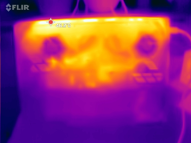 Zmierzyliśmy gorące punkty o temperaturze około 40°C pod obciążeniem, szczególnie na spodzie i w pobliżu centralnego obszaru zawiasu.