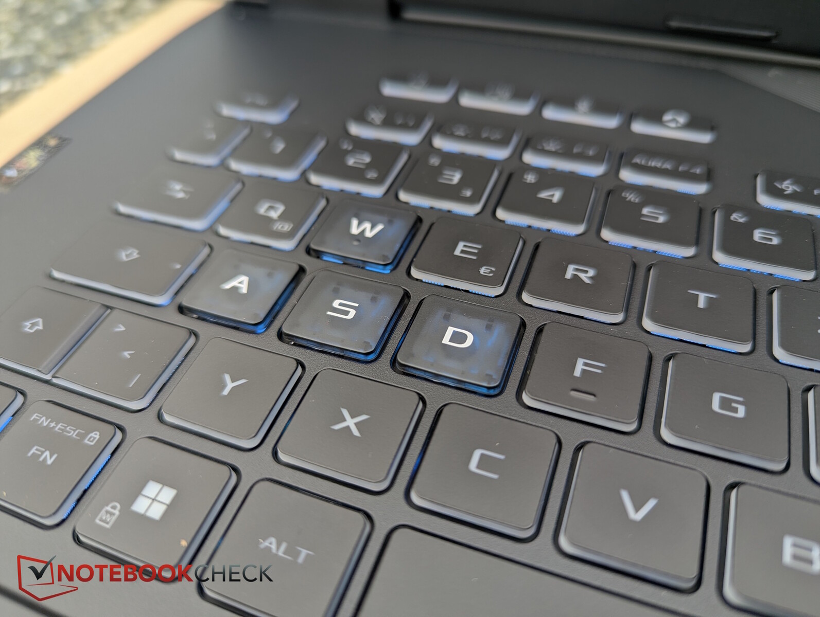 Pomimo dużego rozmiaru, ciche klawisze są małe. Przynajmniej klawisze strzałek nie są w połowie wysokości, choć są nieco ciasne. Umieszczenie często używanego klawisza kasowania wydaje się niezręczne, podczas gdy cztery dedykowane klawisze funkcyjne są miłym akcentem. Skok klawiszy jest bardzo płytki, ale sprzężenie zwrotne jest akceptowalne.