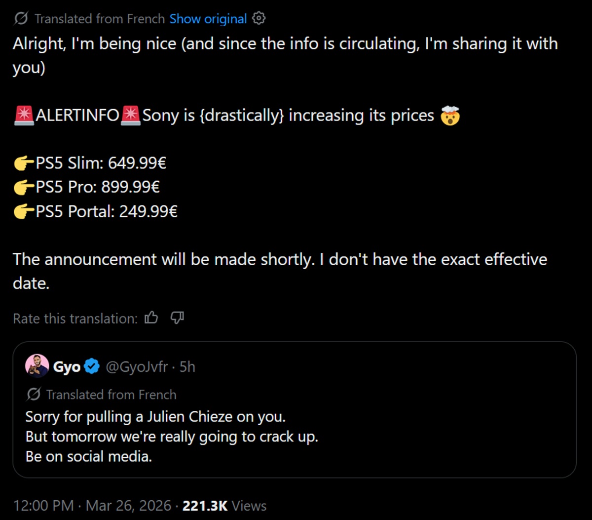 Wcześniej w 2026 roku, Dyrektor finansowy Sony Lin Tao wyjaśnił, że producent przygotował się na niedobór pamięci. Niezależnie od tego, w co najmniej jednym regionie konsole PlayStation mogą wkrótce jeszcze bardziej rozciągnąć budżety. Francuski twórca treści https://x.com/GyoJvfr/status/2037198063031206068 ujawnił nowe, znacznie wyższe ceny Ceny PS5 i PS5 Pro.