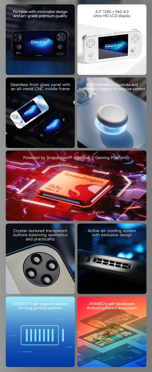 Dodatkowo, Ayaneo wyposaża Pocket S Mini w 4,2-calowy wyświetlacz o natywnej rozdzielczości 1280 x 960 pikseli i proporcjach 4:3. Nie ma jednak informacji o szczytowych wartościach jasności. Niezależnie od tego, Pocket S Mini jest również wyposażony w pamięć RAM LPDDR5X taktowaną zegarem 8,533 MT / s oraz pamięć flash UFS 4.0 lub UFS 3.1 z 128 GB SKU.