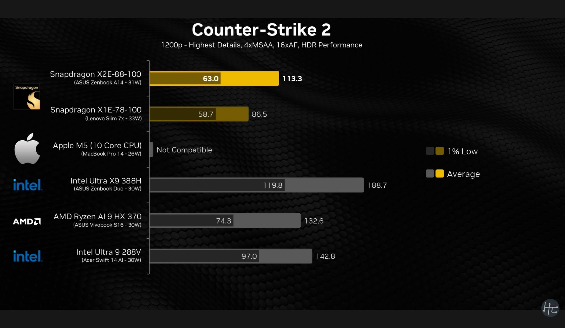 Ten sam wzorzec obserwujemy w Counter-Strike 2, gdzie Snapdragon X2 Elite osiąga średnio ponad 113 FPS, ale 1% Lows utrzymuje się na poziomie 63 FPS. Proszę porównać to ze średnią Core Ultra X9 388H wynoszącą 188,7 FPS i 1% Lows na poziomie 119,8 FPS, a problem stanie się całkiem jasny.