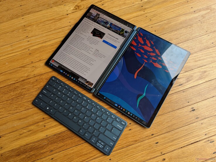 Zaprezentowany na targach CES 2023, Yoga Book 9i 2-w-1 Dual Screen to ryzykowna, ale intrygująca koncepcja konwertowalna, w której obie twarze B i C są identycznymi 13,3-calowymi ekranami dotykowymi OLED. Klawiatura została zdegradowana do zewnętrznego dodatku Bluetooth, a clickpad jest teraz wirtualny na dodatkowym ekranie dotykowym. Takie podejście różni się od Asusa ZenScreen Asus Zenbook Pro 14 Duo in review: Dual-screen laptop with a fast 120 Hz OLED display , który ma znacznie mniejszy dodatkowy ekran dotykowy