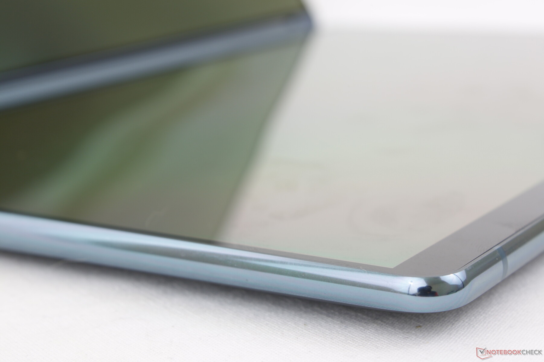 Sztywność obudowy jest doskonała, bez większych problemów związanych ze skręcaniem lub zginaniem. W rzeczywistości ogólna jakość wykonania jest lepsza niż oczekiwano, ponieważ obudowa składa się z mniejszej liczby pojedynczych elementów ze względu na brak zintegrowanej fizycznej klawiatury i clickpada. Nacisk na którykolwiek z dwóch ekranów dotykowych Gorilla Glass nie spowodowałby żadnych zauważalnych wgłębień lub słabych punktów. Podobnie, zawiasy są również napięte i w większości jednolite pod każdym kątem do 360 stopni. Jesteśmy pod wrażeniem konstrukcji i jakości urządzenia, biorąc pod uwagę, że jest to tylko produkt pierwszej generacji. Jeśli mielibyśmy mieć jakieś uwagi krytyczne, to byłoby to zmniejszenie grubości górnej ramki, ponieważ jest ona nieco grubsza niż w zwykłej klapce Yoga 9i.