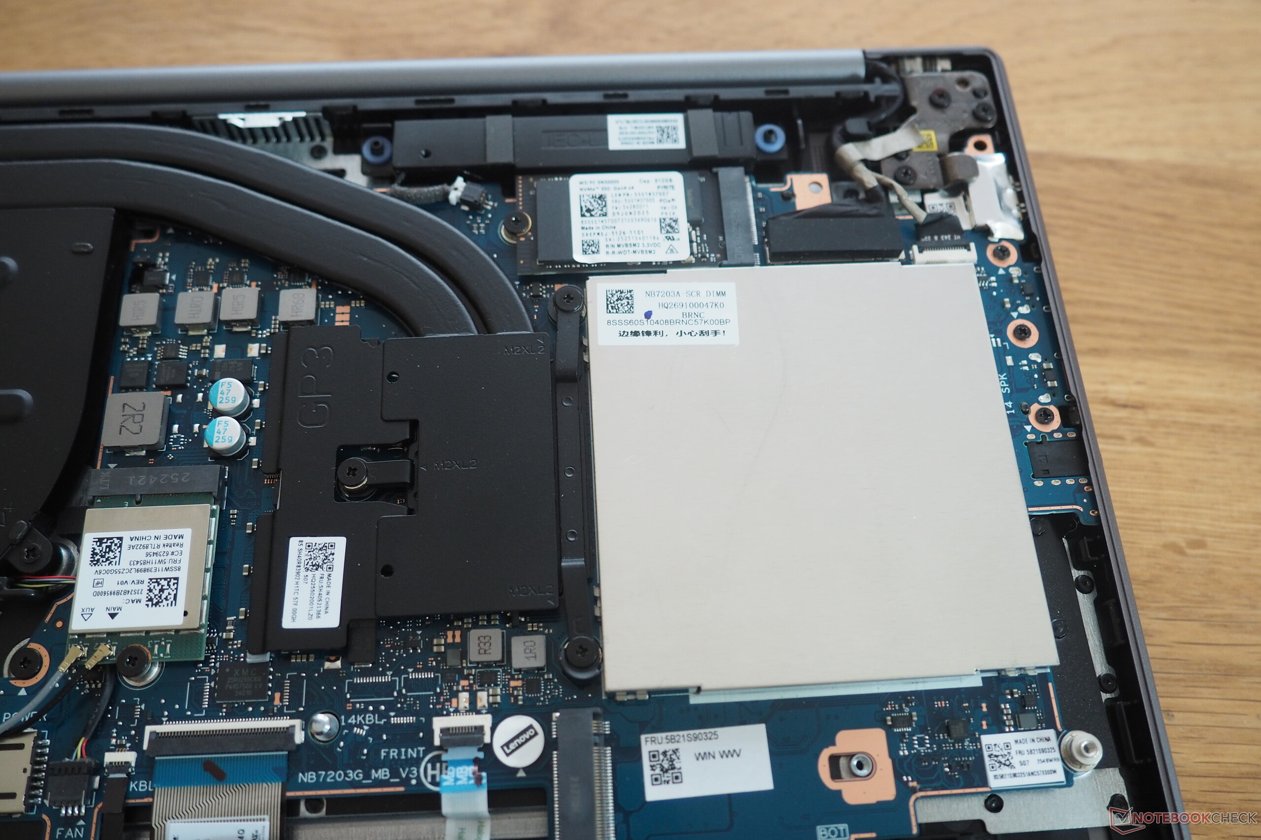 Po lewej stronie znajdziemy dwa porty USB-C 3.1 Gen 2 z obsługą DisplayPort 1.4 i PowerDelivery, a także wyjście HDMI i połączone gniazdo audio. Po prawej stronie znajduje się dość szybki czytnik kart microSD i dwa konwencjonalne porty USB-A 3.0. Port Ethernet nie jest dołączony, ale laptop posiada bardzo szybki moduł Wi-Fi 7. Kamera internetowa, która zawiera migawkę prywatności, oferuje tylko rozdzielczość 0,9 MP, ale nadal zapewnia ostrzejszy obraz niż wiele konkurencyjnych modeli. Dolną pokrywę można łatwo zdjąć po odkręceniu sześciu śrub Torx. Wewnątrz znajdziemy dwa zajęte sloty SO-DIMM oraz dwa sloty M.2. Slot 2280 jest wolny, podczas gdy zainstalowany dysk SSD znajduje się w mniejszym slocie 2242.