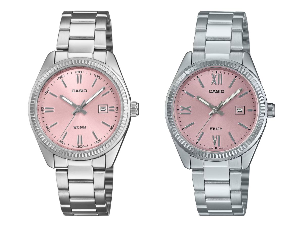 Nowy zegarek Casio LTP-1302PD-4AV ma pastelową różową tarczę z srebrnymi indeksami i wskazówkami. Pasują one do otaczającej srebrnej chromowanej obudowy o wymiarach 34,5 x 30,2 x 8,7 mm (~1,36 x 1,19 x 0,34 cala). Model ten posiada również bransoletę ze stali nierdzewnej i karbowany bezel.
