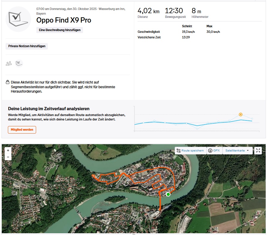 Aby przetestować dokładność pozycjonowania w codziennym życiu, zabraliśmy Find X9 Pro na krótką przejażdżkę rowerową i porównaliśmy zmierzone wartości z Garmin Venu 2 jako punktem odniesienia. W najlepszym przypadku pozycja telefonu Oppo jest określana za pomocą dwuzakresowego GNSS i szybkiego Satfix - nawet wewnątrz budynków.