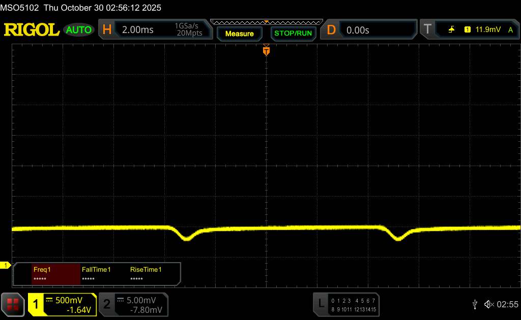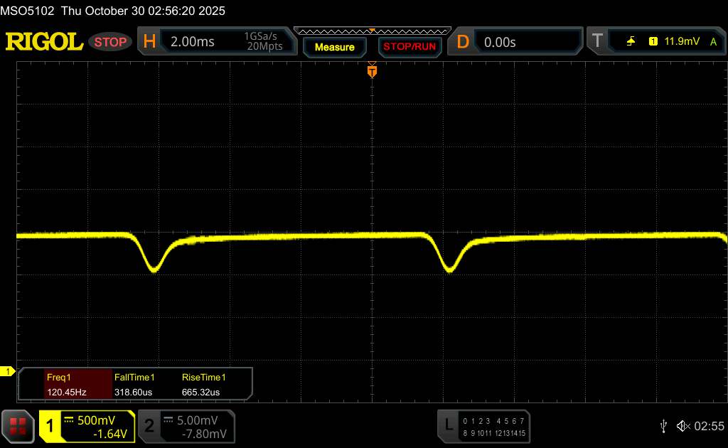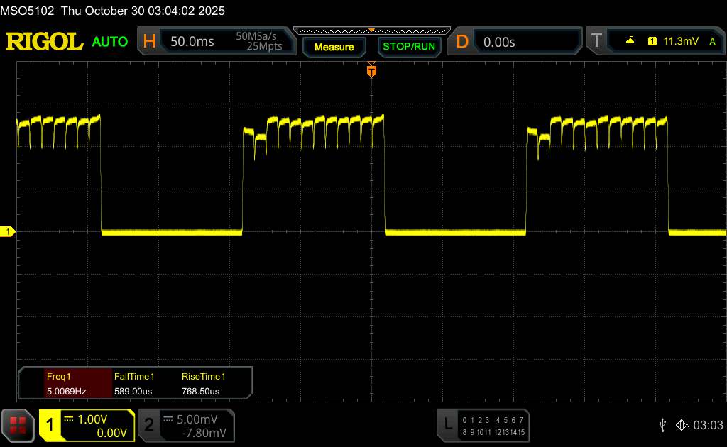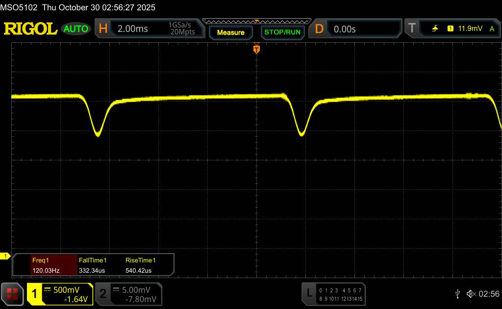 Technologia OLED w Find X9 Pro wykorzystuje modulację szerokości impulsu do kontrolowania jasności ekranu. Według producenta oferowane jest ściemnianie PWM o wysokiej częstotliwości przy 2160 Hz, co minimalizuje negatywne skutki migotania. Zmierzyliśmy częstotliwość bazową 466 Hz za pomocą oprogramowania Rigol.