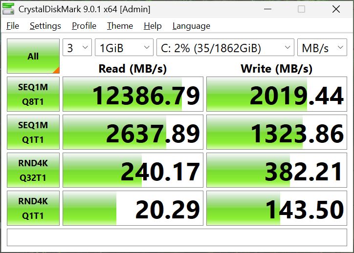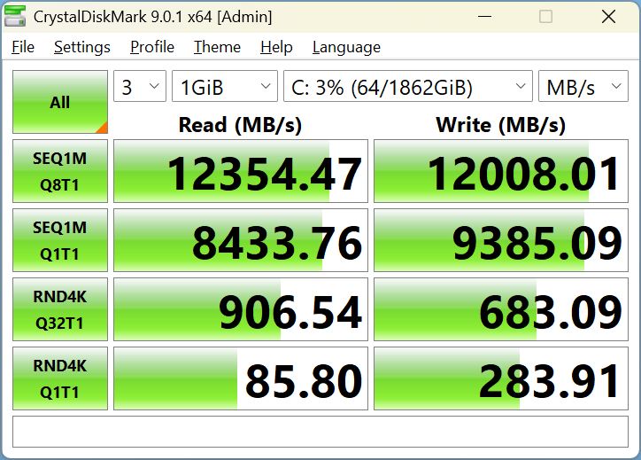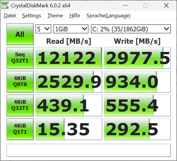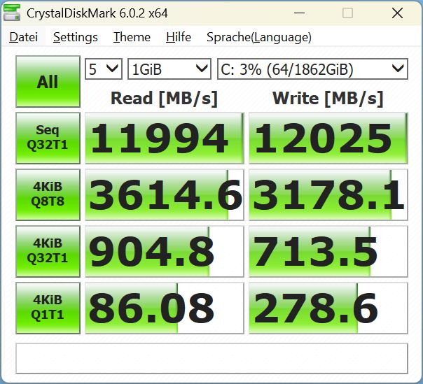 Przy drugiej próbie wyniki wyglądają znacznie lepiej: według CrystalDiskMark 6 dysk osiąga prawie 12 000 MB/s zarówno w odczycie, jak i zapisie - imponujący wynik. CrystalDiskMark 9 pokazuje nawet nieco wyższe liczby, podczas gdy AS SSD jest nieco bardziej powściągliwy.