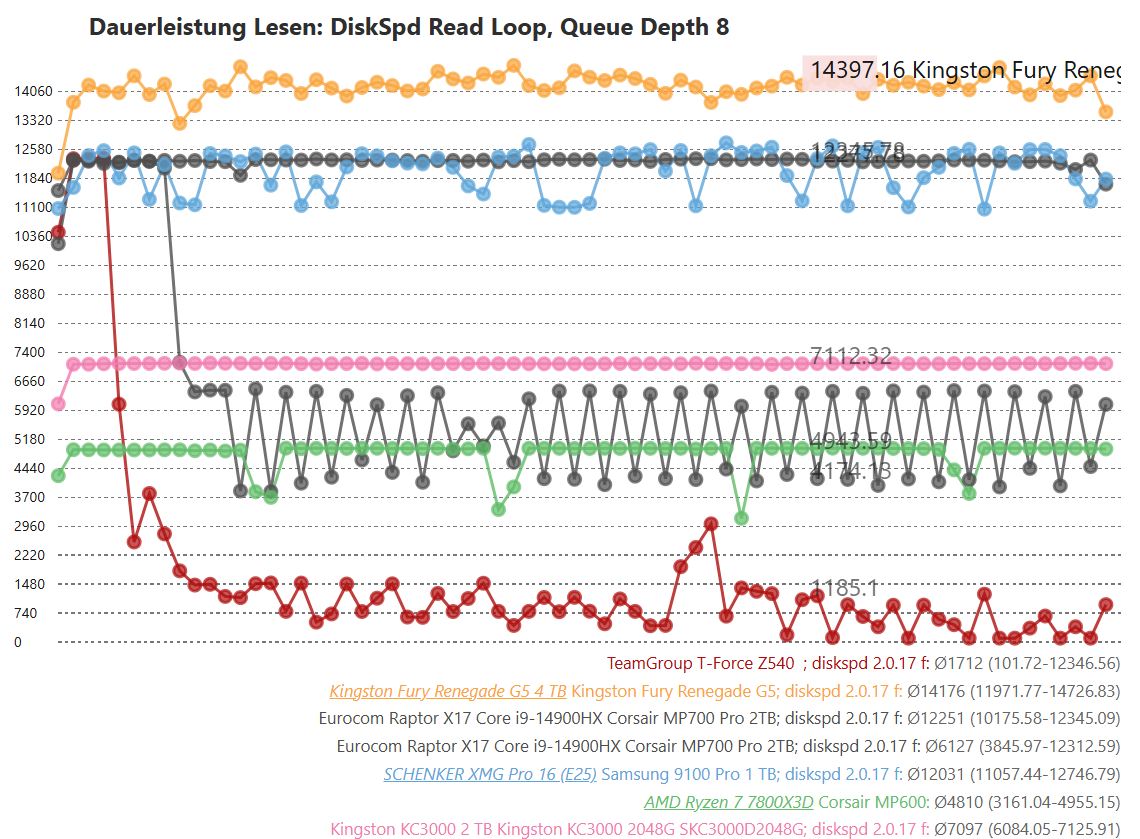 W naszym teście wytrzymałości za pomocą DiskSpd, T-Force Z540 również utrzymał niezmiennie wysoką wydajność. Nie do końca dorównuje szybkości dysku Kingston Fury Renegade G5ale wyniki są nadal wyjątkowo dobre