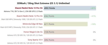 Pod względem GPU również nie ma wiele między tymi dwoma urządzeniami. Poco X7 uzyskuje wynik 146 179 po stronie GPU, podczas gdy Poco X6 117 863. W teście 3DMark WildLife Extreme, Poco X7 uzyskał wynik 842 w porównaniu do 788 w Poco X6. W teście 2560x1440 Sling Shot Extreme (ES 3.1) Unlimited, Poco X7 uzyskał 5308 punktów, podczas gdy Poco X6 4993 punkty.