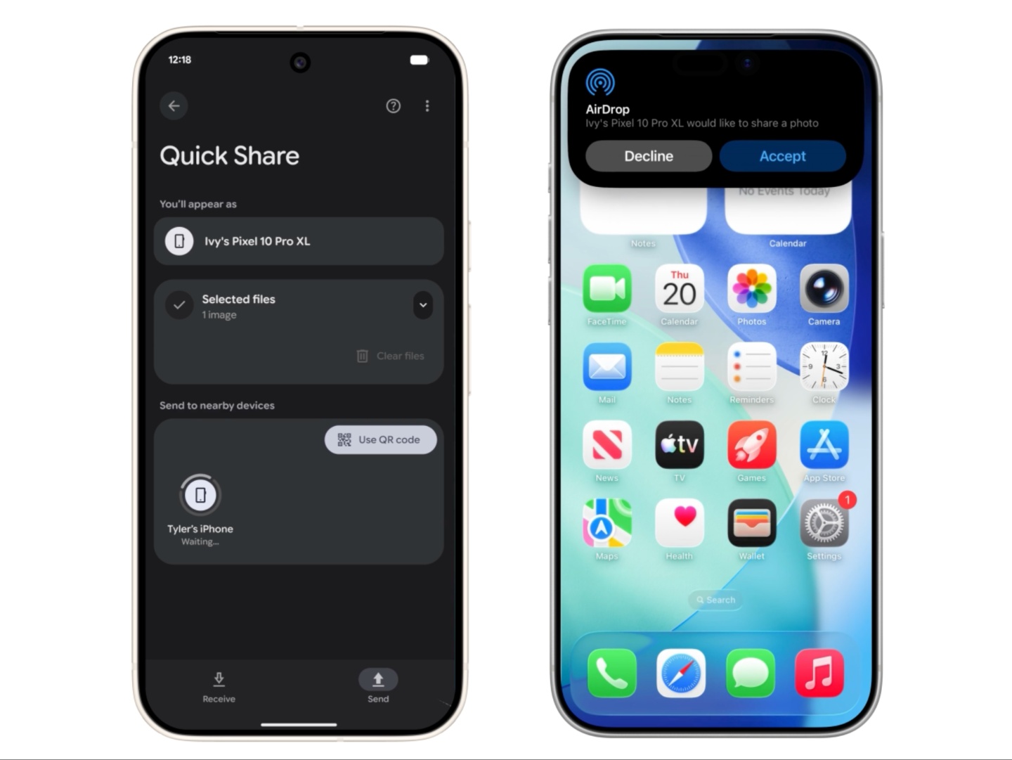 Jak pokazano na animacji, menu Quick Share będzie w stanie znaleźć iPhone'y, które mają włączony AirDrop, gdy znajdują się w pobliżu z widocznością ustawioną na "Wszyscy przez 10 minut", a następnie łatwo wysyłać pliki. Podobnie, właściciele iPhone'ów lub dowolnego urządzenia Apple z AirDrop mogą korzystać z menu AirDrop, aby udostępniać pliki pobliskim urządzeniom Pixel 10. Google twierdzi, że funkcja ta zaczyna być dostępna dla serii Pixel 10 już dziś (20 listopada), a firma pracuje nad rozszerzeniem jej na inne urządzenia Android.