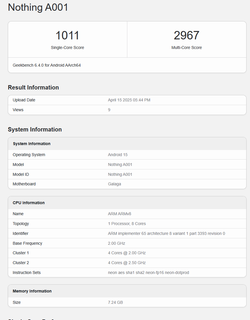 Rzekoma lista Geekbench tego, co wygląda jak CMF Phone 2 Pro (nazwa kodowa Nothing A001) pokazuje, że działa na nim MediaTek Dimensity 7300 SoC z Arm Mali-G615 MP2 GPU, 4x rdzeniami Cortex-A78 o taktowaniu 2,5 GHz i 4x rdzeniami Cortex-A55 o taktowaniu 2,0 GHz. Ten konkretny wariant był wyposażony w 8 GB pamięci RAM i działał pod adresem Android 15.