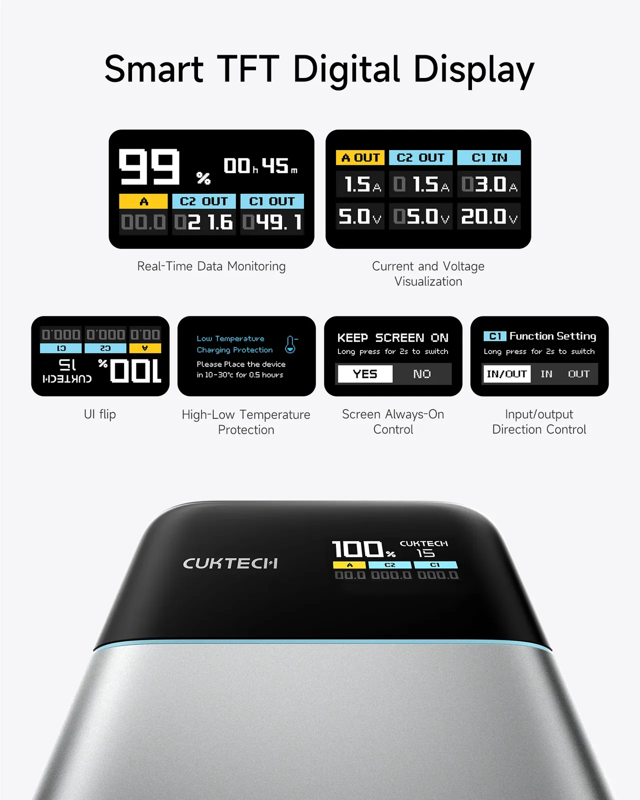 Użytkownicy mogą monitorować ładowanie w czasie rzeczywistym za pomocą wbudowanego wyświetlacza, który może śledzić minuty użytkowania, poziom naładowania power banku oraz poziomy prądu i napięcia dla każdego portu.