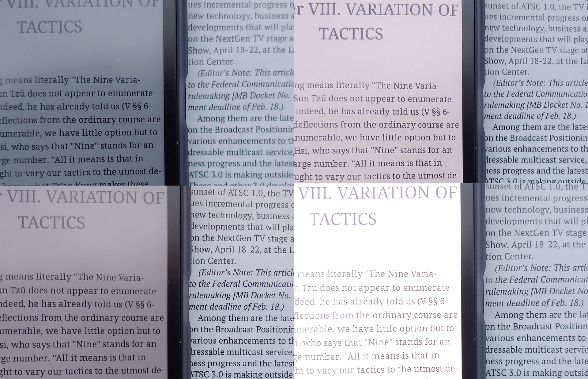 Jego gama kolorów i kontrast są ograniczone w porównaniu do czasopism, z bielą wyglądającą na jasnoszarą i czernią ciemnoszarą, ale odbija światło jak materiał drukowany i działa w świetle dziennym bez podświetlenia. Jasność podświetlenia i temperatura barwowa są regulowane dla wygodnego użytkowania w pomieszczeniach.