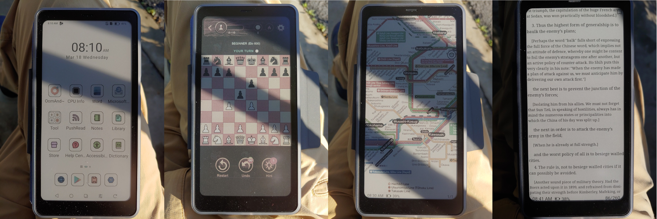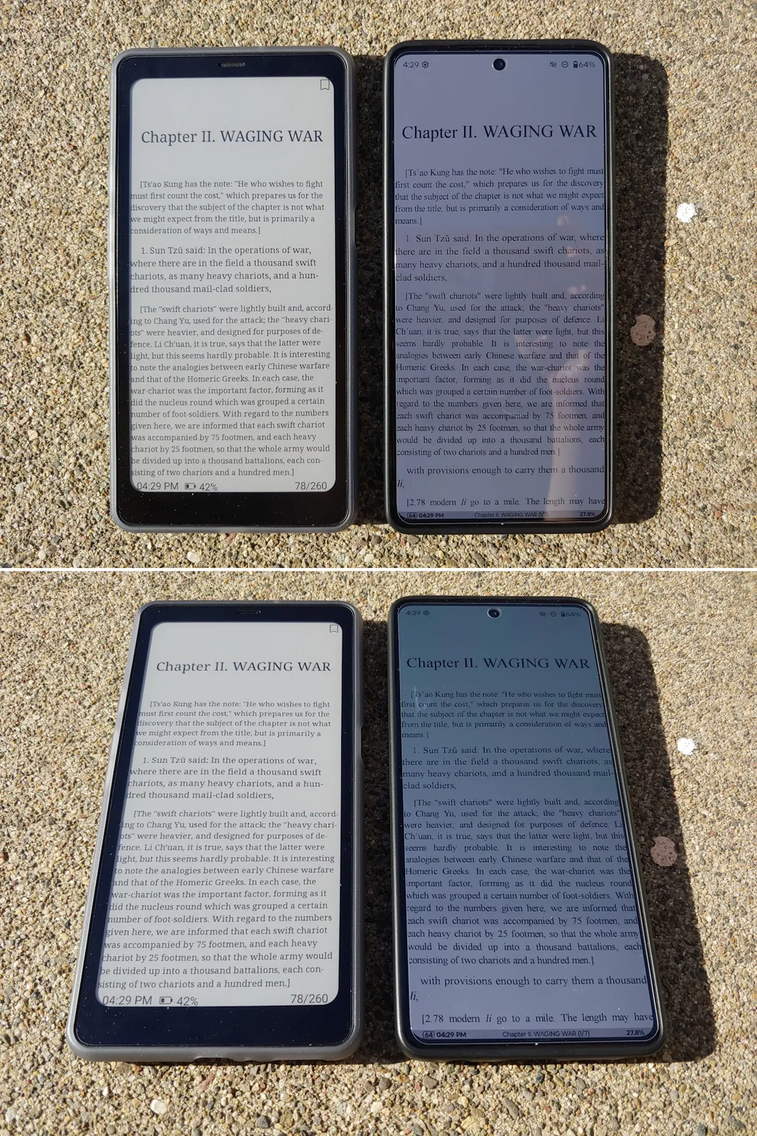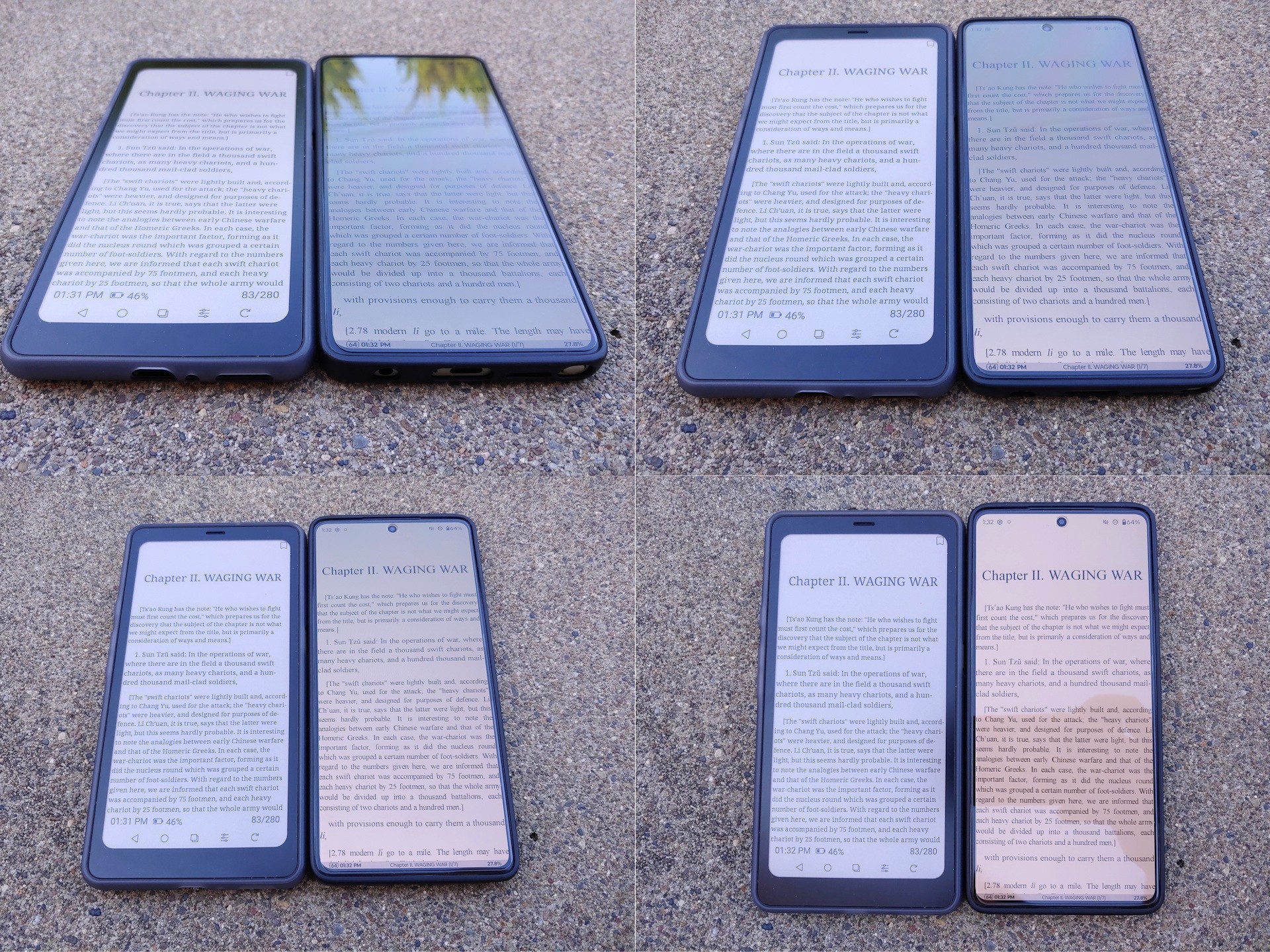 W bezpośrednim słońcu wyświetlacz Kaleido 3 jest znacznie bardziej czytelny niż wyświetlacz Moto G Stylus 2024 OLED przy maksymalnej automatycznej jasności 1200 nitów. W cieniu oba wyświetlacze są podobnie jasne, gdy Moto jest ustawiona na ~550 nitów ręcznie. Panel E Ink pozostaje również czytelny pod dowolnym kątem bez odbić i zmian kolorów OLED.