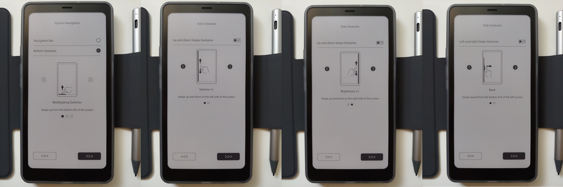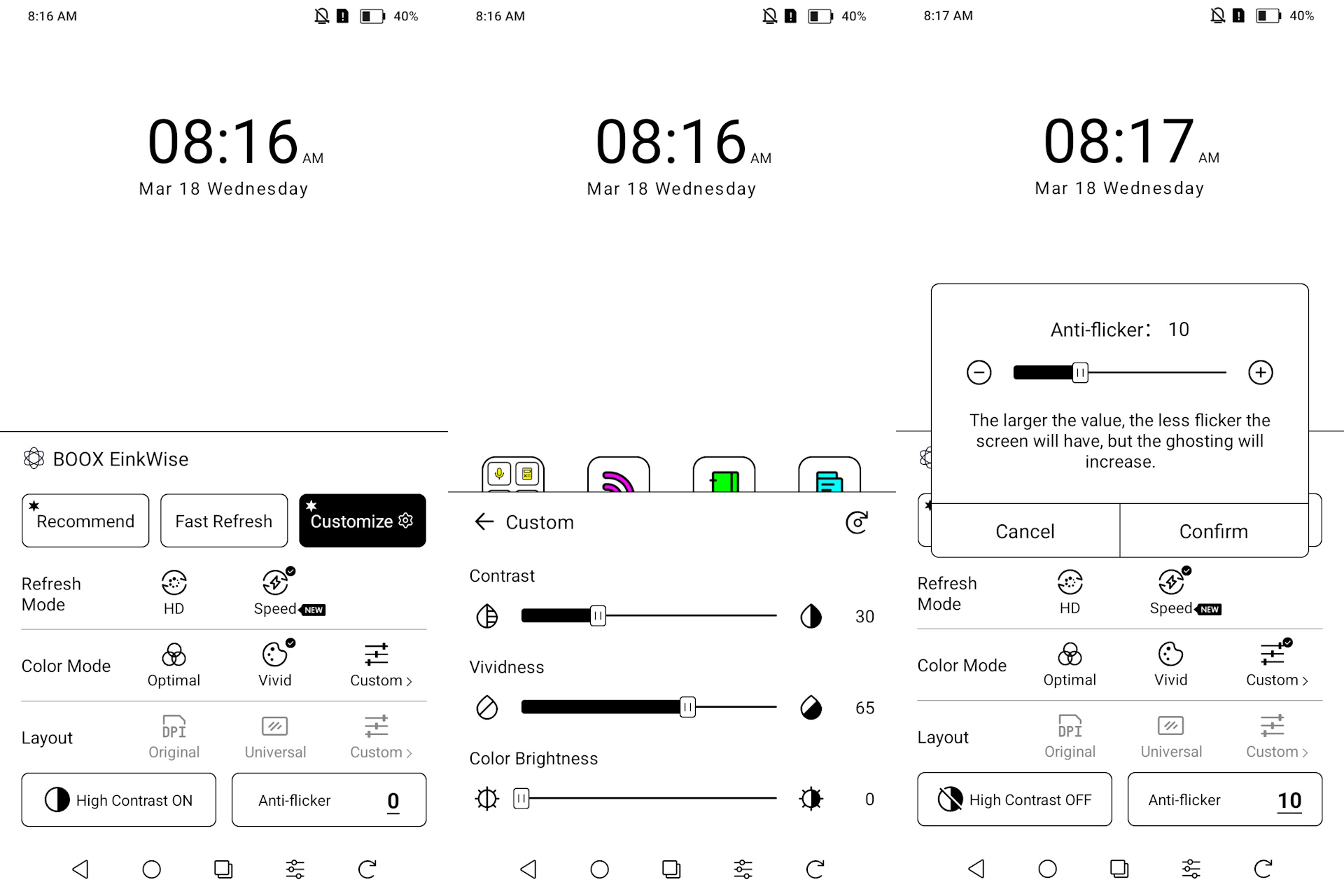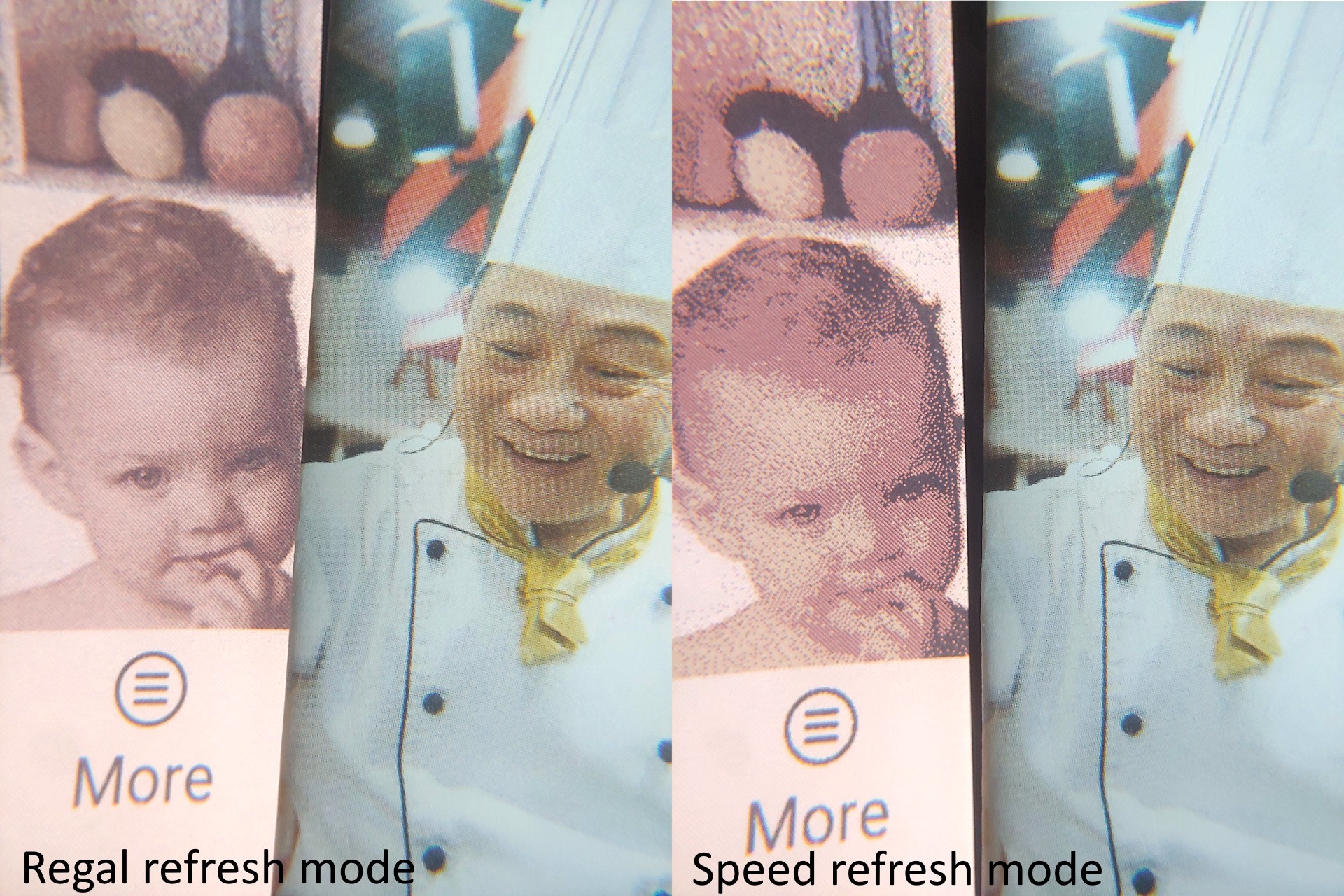 Tryb szybkiego odświeżania umożliwia szybkie przewijanie, ale obniża jakość obrazu, podczas gdy tryby Regal i HD poprawiają przejrzystość kosztem wolniejszych interakcji i sporadycznych odwróconych błysków. Jakość zbliża się do poziomu gazetowego w wyższych trybach i staje się zauważalnie bardziej szorstka w trybie Speed.