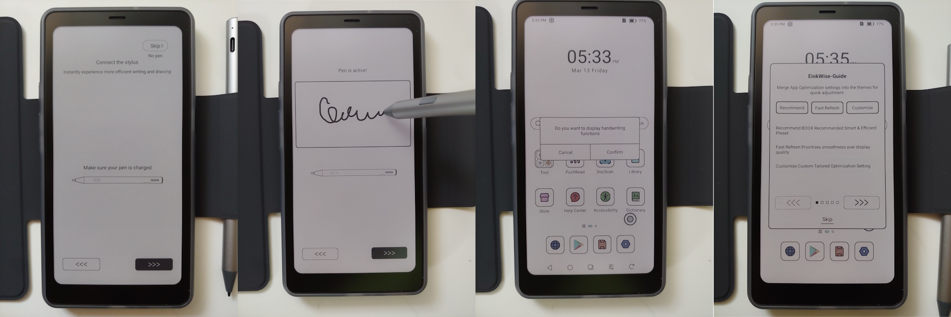 Konfiguracja przebiegła szybko, z monitami o język, czas, GUI, konfigurację pióra i EinkWise przed przejściem do ekranu głównego. Konto Google nie jest wymagane, choć asystent AI wymaga konta Onyx.