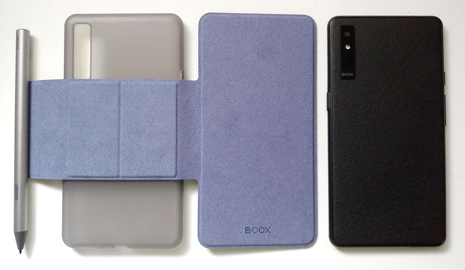 Czytnik współpracuje z magnetycznym rysikiem i etui. Rysik przyczepia się do gołego grzbietu Booxa lub klapki etui. Boox mieści się w plastikowej obudowie, a następnie magnetycznie przyczepia się do pokrywy, którą również można dość łatwo poluzować.