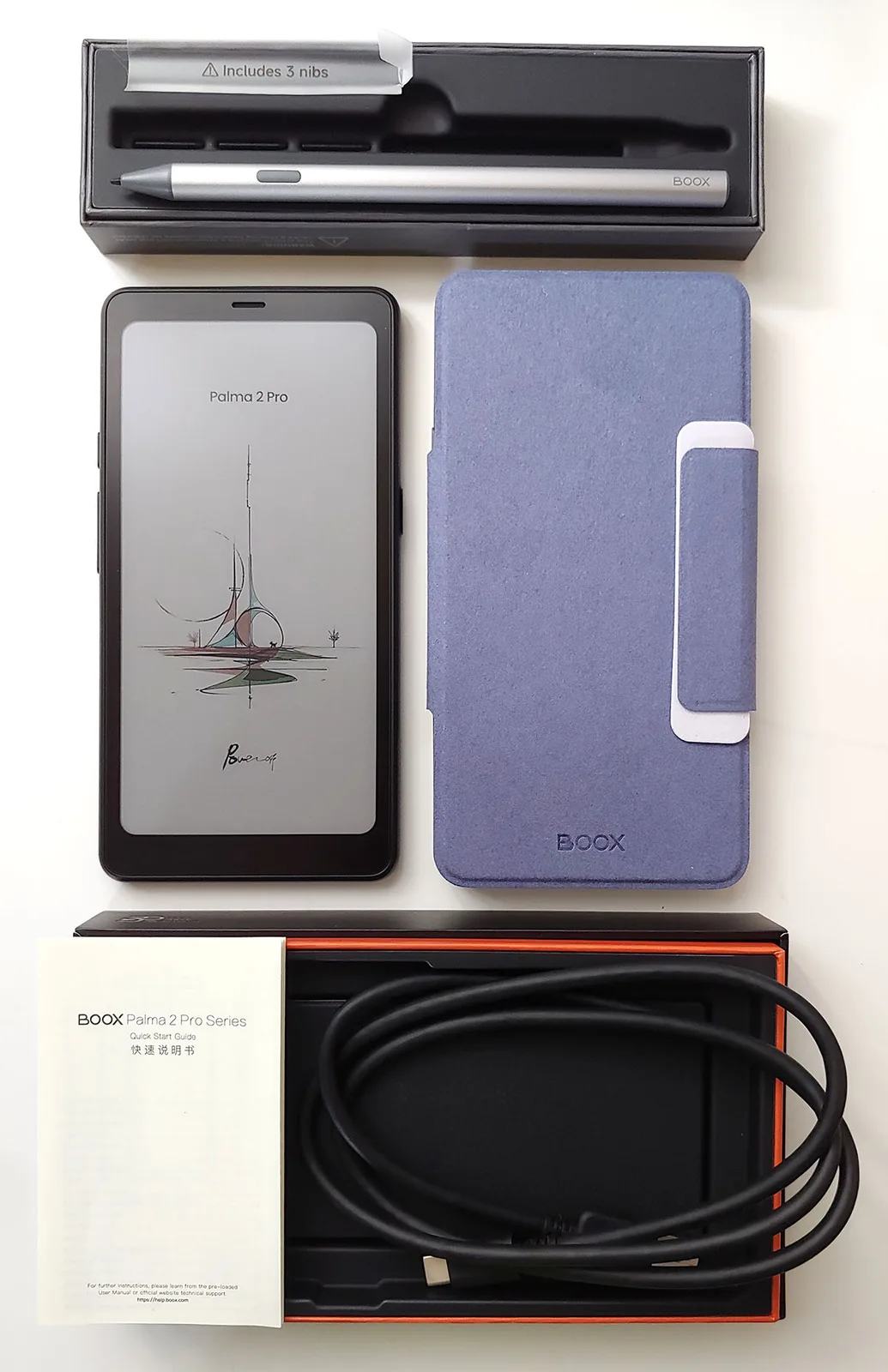 Do e-czytnika dołączono kabel USB-C, skróconą instrukcję obsługi i narzędzie do wysuwania karty SIM, a także opcjonalne etui magnetyczne i rysik z trzema wymiennymi wkładami.