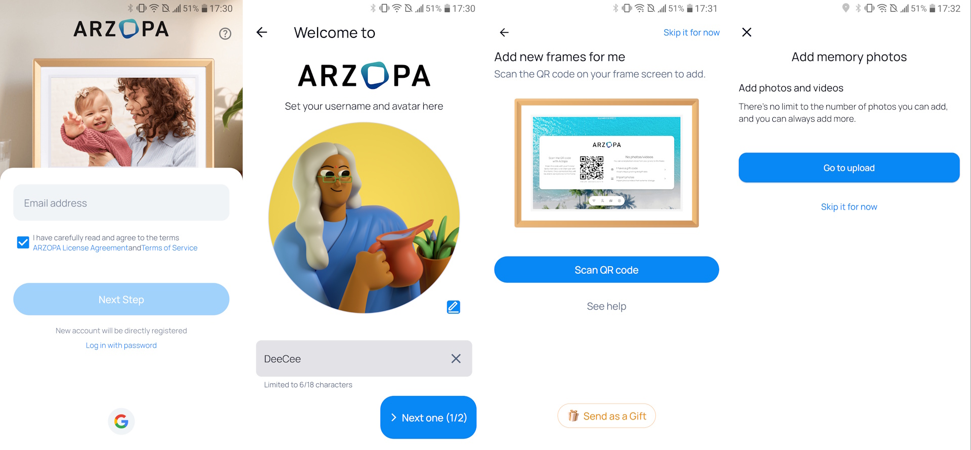 Oprogramowanie jest łatwe w instalacji, a dodanie zdjęcia zajmuje zaledwie kilka sekund. Dostęp do ramki Arzopa można udostępnić znajomym i rodzinie, umożliwiając wszystkim zdalne przesyłanie zdjęć za pośrednictwem aplikacji. Aplikacja pozwala również kupującym wstępnie załadować błogosławieństwo i zdjęcie przed podarowaniem, a właściciele mogą dodawać kody podarunkowe, aby importować dodatkowe zdjęcia z wydarzeń.
