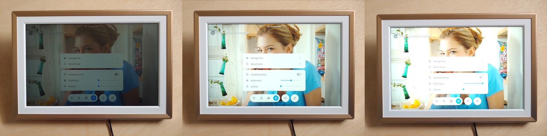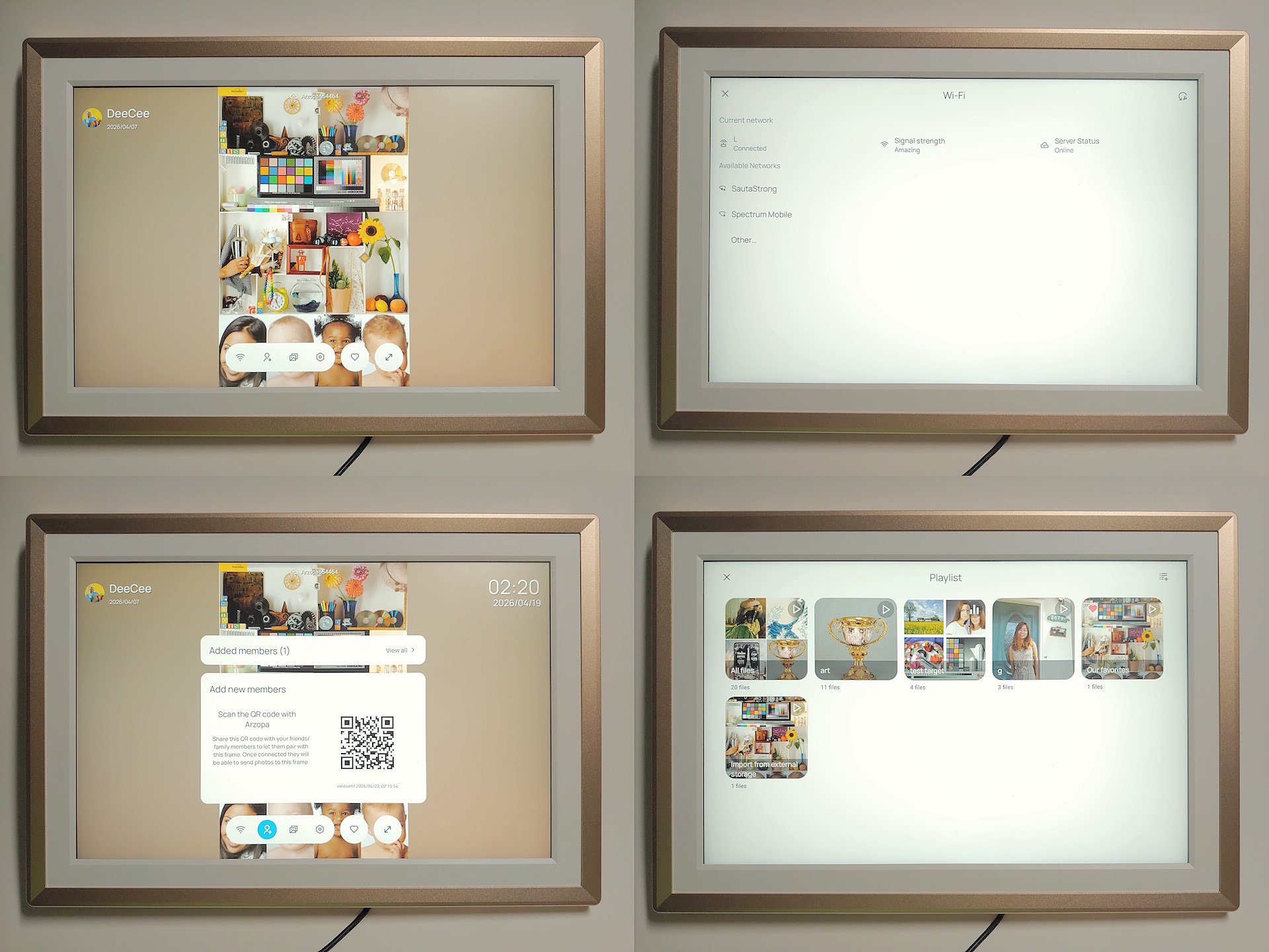 Ustawienia Wi-Fi ułatwiają dodawanie nowego połączenia, choć sieci proxy nie są obsługiwane. Ustawienia użytkownika umożliwiają szybkie dodawanie nowych członków, którzy mogą zdalnie przesyłać zdjęcia. Menu Zdjęcia pozwala użytkownikom odtwarzać multimedia z karty SD, przesyłać pliki przez USB, usuwać elementy lub resetować ramkę, z folderami dostępnymi do organizowania dużych bibliotek. Ustawienia systemowe kontrolują jasność, głośność, automatyczne odtwarzanie zdjęć i zarządzanie plikami.