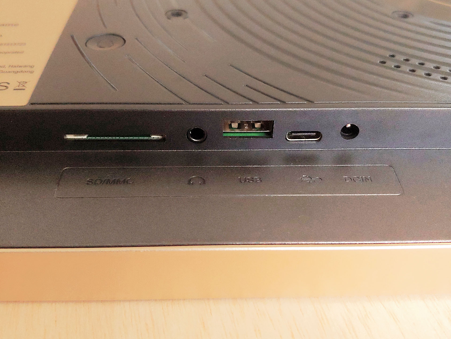 Wszystkie porty - w tym zasilanie, USB-A, USB-C, gniazdo kart SD i gniazdo słuchawkowe 3,5 mm - znajdują się z tyłu. Nie ma przycisku zasilania, więc podłączenie go włącza go, a wyłączenie lub uśpienie odbywa się za pomocą menu.