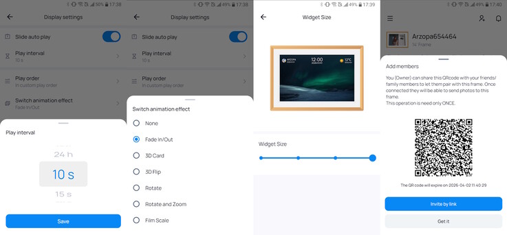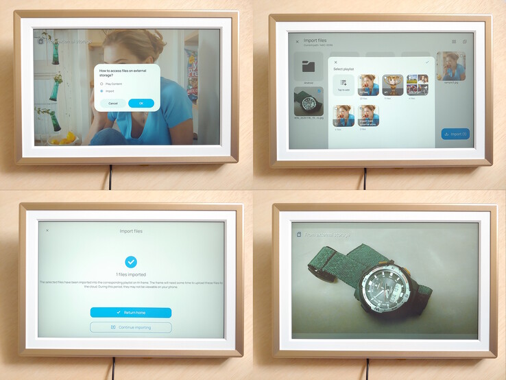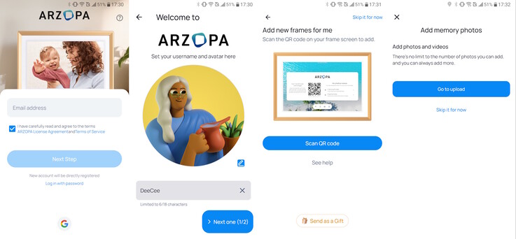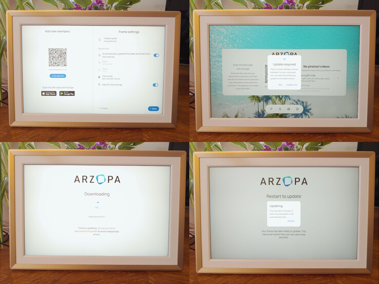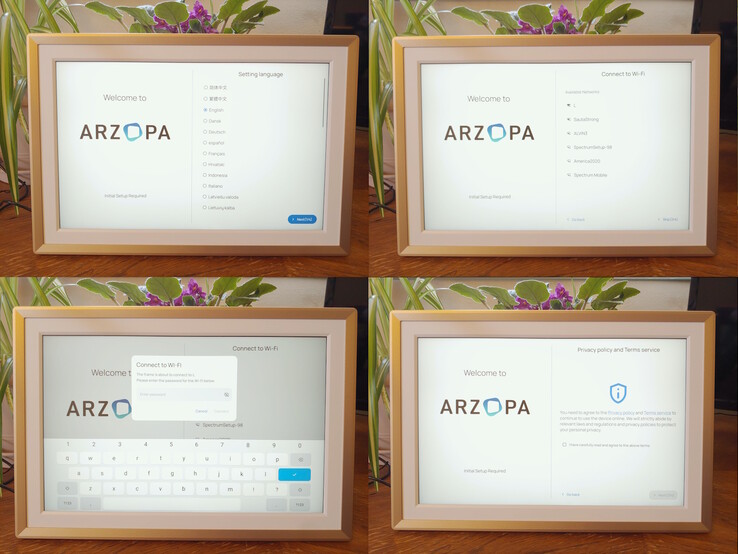 Początkowa konfiguracja sprzętu składa się z kilku ekranów, w tym wyboru języka, opcjonalnej konfiguracji Wi-Fi, zgody na warunki świadczenia usług i polityki prywatności oraz ustawień czasu/daty. Użytkownicy mogą udostępnić wyświetlany na ekranie kod QR na ostatnim ekranie znajomym i rodzinie, aby uzyskać dostęp do ramki na zdjęcia lub dodać kod podarunkowy, aby zobaczyć podarowane zdjęcia, takie jak te z wesela. W recenzowanym urządzeniu wymagana była aktualizacja oprogramowania układowego, której instalacja zajęła kilka minut.