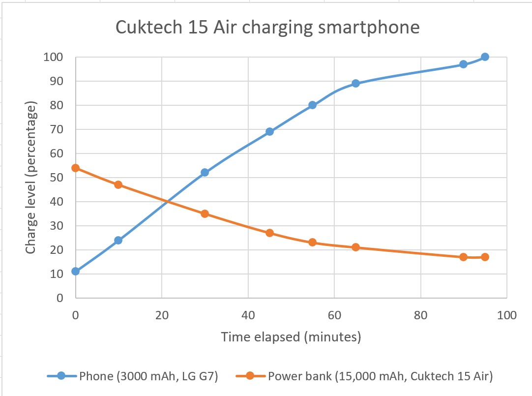 Część energii pobieranej z power banku jest nieuchronnie tracona podczas ładowania. Po dwukrotnym naładowaniu LG G7 (bateria 3000 mAh) z 20% do 100%, 15 Air (bateria 15000 mAh) spadł ze 100% do 53%. Około 4800 mAh zostało dodane do telefonu, podczas gdy 7050 mAh zostało pobrane, pozostawiając 2250 mAh (~ 32%) utracone.