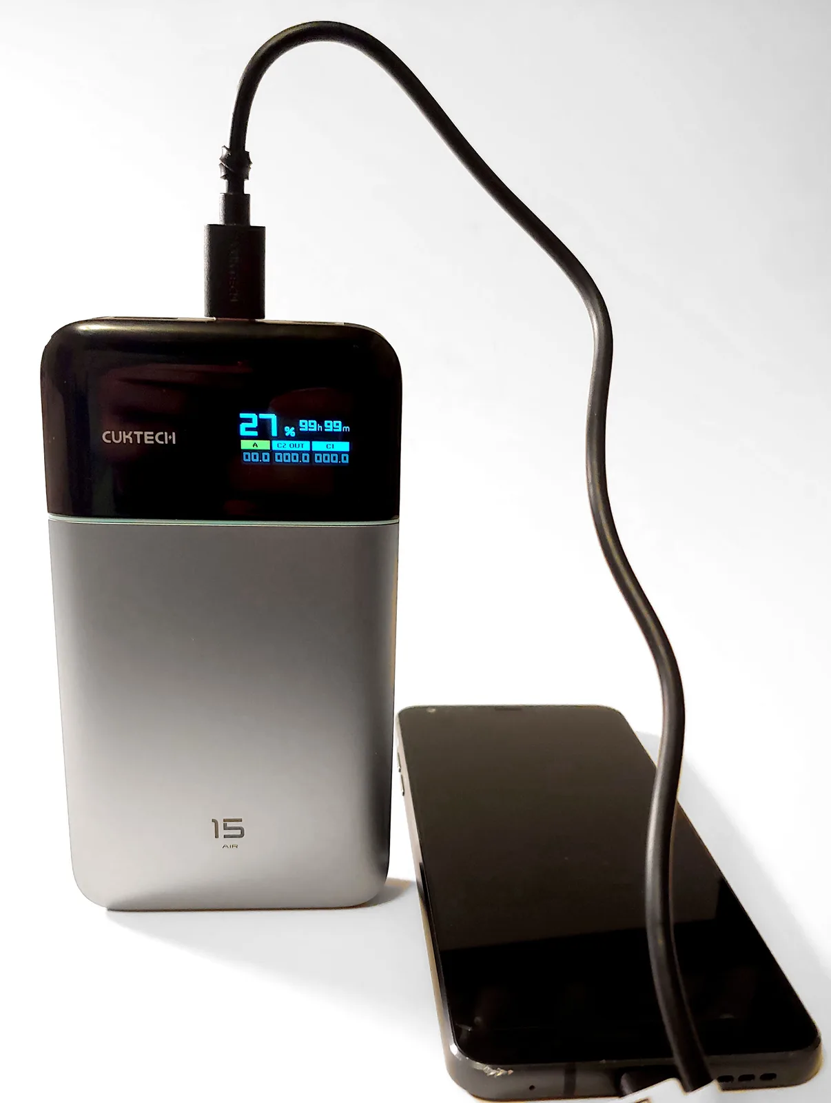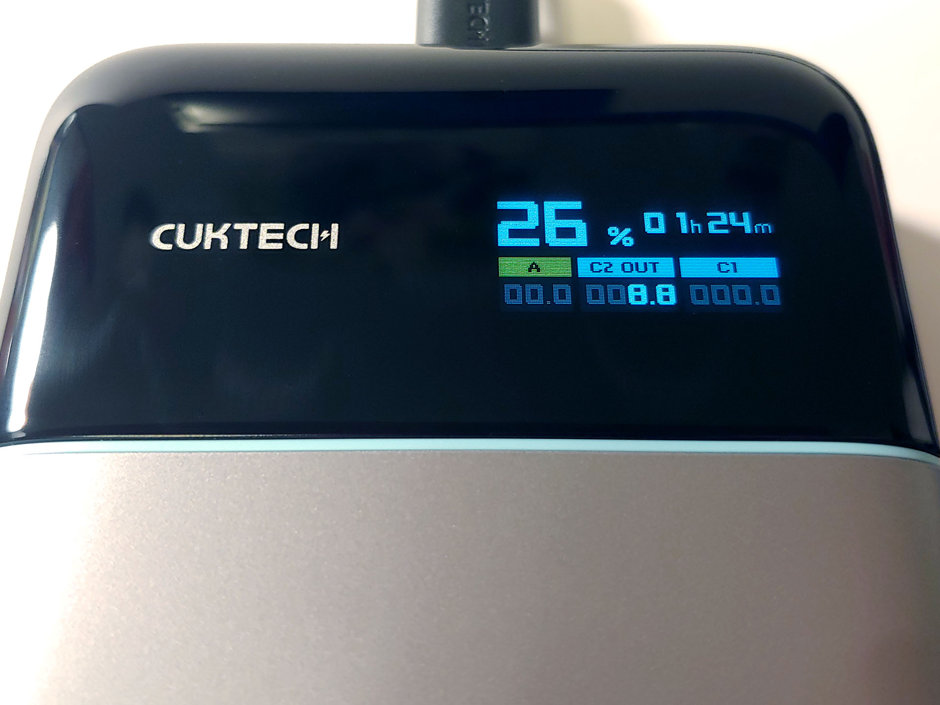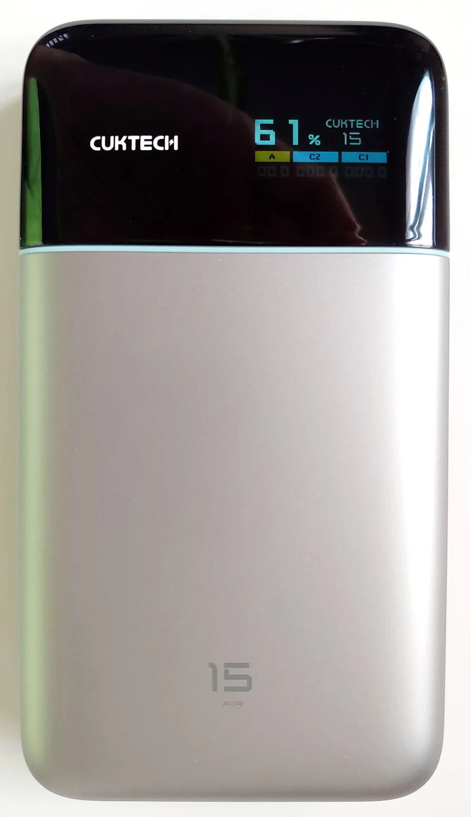 The Cuktech 15 Air szybko ładuje do trzech urządzeń z mocą wyjściową 65 W i obsługuje wejście 100 W do szybkiego ładowania. Kolorowy wyświetlacz pokazuje stan baterii w czasie rzeczywistym, czas do wyczerpania i dane dotyczące mocy każdego portu.