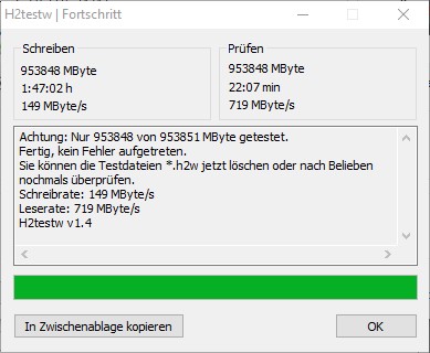 Znacznie bardziej interesujące i znaczące są prędkości, z jakimi urządzenie przesyła duże ilości danych. H2testw to narzędzie, które może skutecznie symulować taki scenariusz. XS1000 potrzebował dokładnie 6:00 minut na zapisanie 100 GB danych testowych, co przekłada się na dokładnie 278 MB/s. Wskazuje to, że plik tej wielkości można przenieść w takim czasie. Udało nam się nawet uzyskać prędkość 149 MB/s podczas zapisu na całym dysku. Proces odczytu i weryfikacji również przebiegał konsekwentnie z prędkością ponad 700 MB/s.
