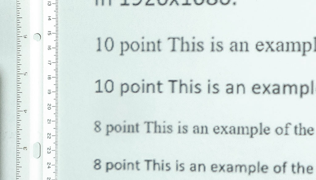 Po podłączeniu do komputera, tekst czteropunktowy i większy jest czytelny, więc TCL C1 może być używany jako zewnętrzny wyświetlacz PC. Piksele stają się widoczne po zbliżeniu się do wyświetlanego obrazu na odległość 1 m (3,3 stopy) lub bliżej, ale generalnie nie są zauważalne przy normalnych odległościach oglądania. Pikselizacja staje się uciążliwa w przypadku mniejszego tekstu o rozmiarze poniżej sześciu punktów. Rampy szarości nie są idealnie gładkie, ale widoczne pasma kolorów są generalnie ograniczone do ciemnych cieni i płaskich obszarów kolorów.