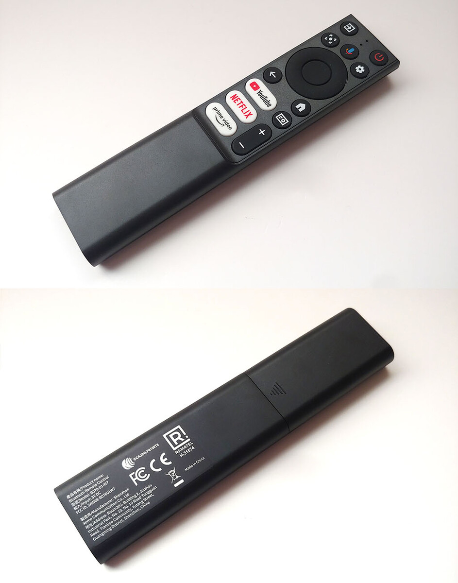Przyciski zasilania, domu i ustawień znajdują się w górnym rzędzie, następnie cztery przyciski strzałek wokół centralnego przycisku OK, następnie rząd przycisków cofania, informacji i trybu wejścia, a następnie dwa rzędy przycisków dedykowanych do uruchamiania Netflix, YouTube i Amazon Prime Video oraz inicjowania automatycznej konfiguracji obrazu. Przyciski głośności i wyciszenia znajdują się w dolnym rzędzie na podwyższonym poziomie, dzięki czemu łatwiej je znaleźć w ciemności.