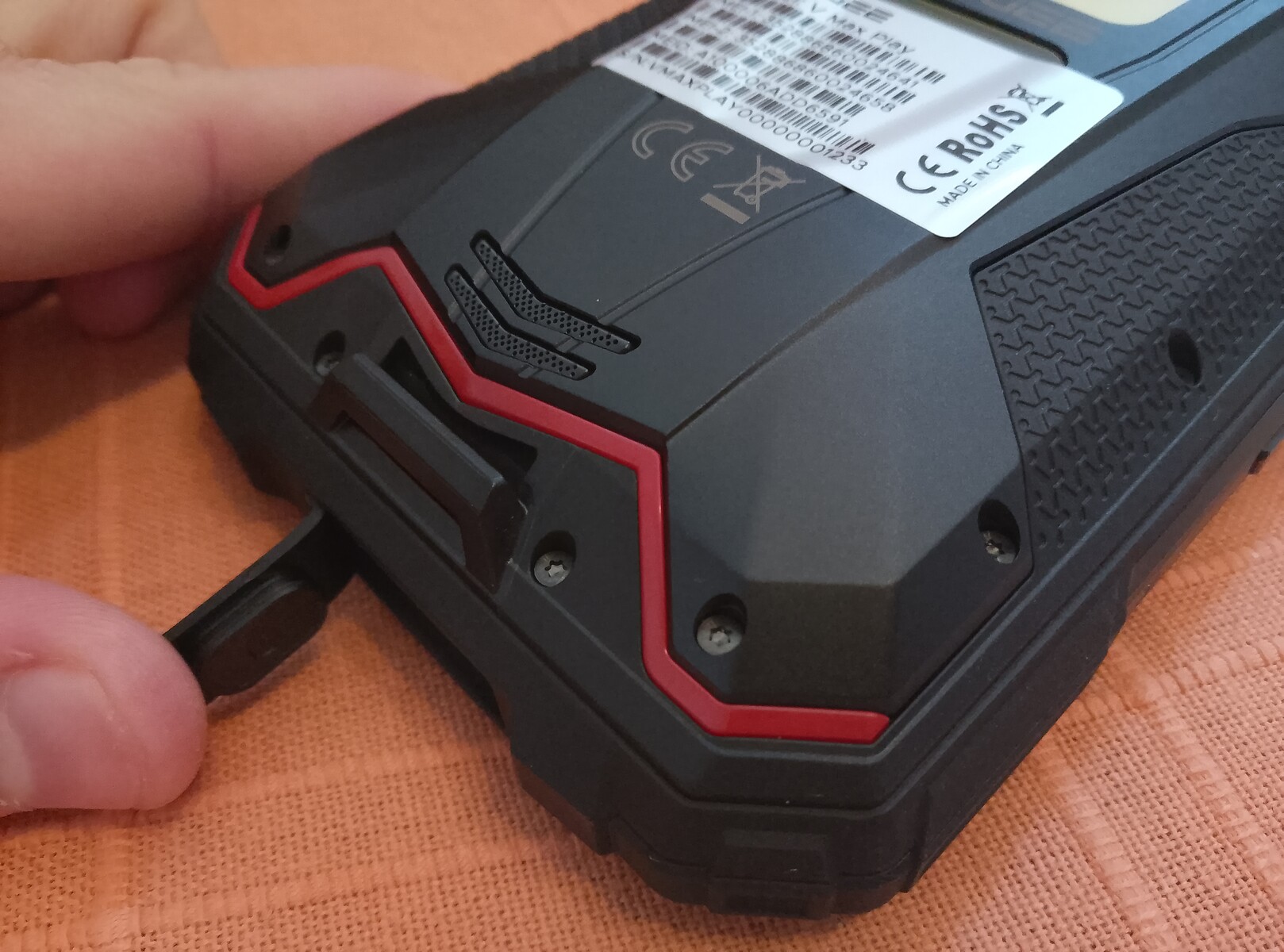 Tacka na kartę SIM po lewej stronie ma wycięcia na 2 karty nano-SIM i jedną kartę micro-SD i można ją łatwo wyjąć i włożyć z powrotem. V Max Play ma w sumie 5 przycisków; są to, w dowolnej kolejności, przyciski zwiększania / zmniejszania głośności, zasilania, projektora i niestandardowy klawisz akcji.