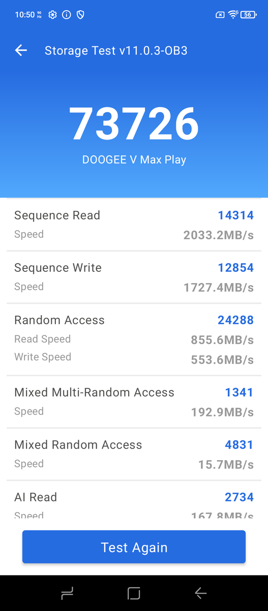 Jego 512-GB układ pamięci masowej jest imponująco szybki, z odczytem sekwencyjnym ~2 GB/s. 16 GB pamięci RAM i zastosowany SoC są również wystarczające do większości zadań; AnTuTu uważa, że testowany V Max Play jest zbudowany wokół Mediatek's Dimensity 7300Xktóry nie różni się zbytnio od Dimensity 7300. Oba posiadają 4 "duże" i 4 "małe" rdzenie o umiarkowanych prędkościach taktowania.