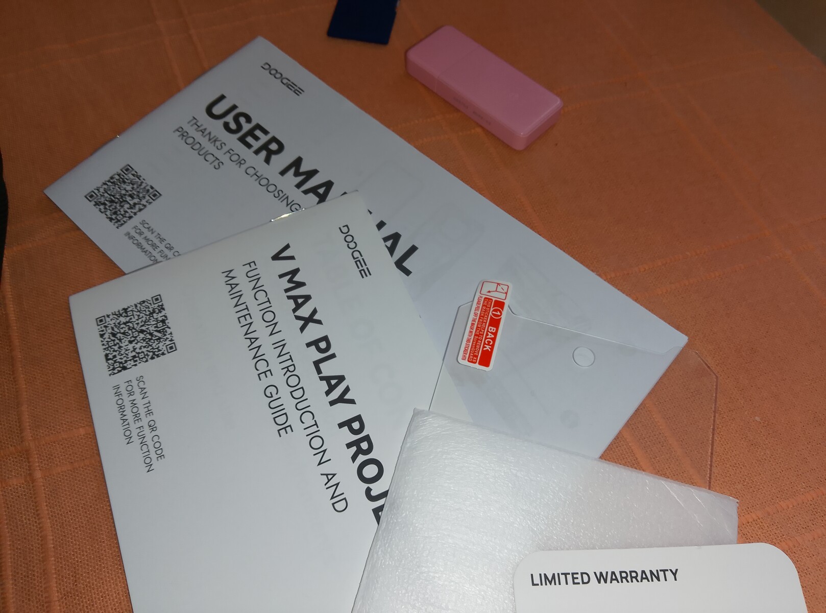 Oprócz zwykłego kartonowego pudełka, bezpieczeństwo telefonu w drodze do użytkownika zapewnia czarne plastikowe etui podróżne. Oprócz V Max Play, etui zawiera małą ładowarkę 45 W, kabel USB-C do USB-C, twardą osłonę wyświetlacza, różne broszury informacyjne i gwarancyjne oraz twardy futerał ochronny na telefon - duży kawałek plastiku, który chroni tył, spód, lewą i prawą stronę telefonu Doogee, z uchwytem po jednej z jego stron. Jest to podstawowy zestaw gadżetów; ci, którzy są gotowi zapłacić nieco więcej, otrzymają również mały głośnik Bluetooth marki Doogee i stojak, który, miejmy nadzieję, ułatwi korzystanie z V Max Play jako projektora.