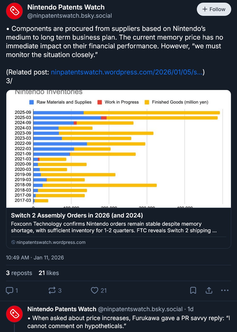 Bezprecedensowe ceny pamięci podnoszą koszty komputerów do gier, ale zagrożone są również konsole. Kyoto Shimbun (paywalled) zapytał prezesa Nintendo Shuntaro Furukawę o potencjalny wpływ na najnowszy handheld firmy. Konto Patents Watch Bluesky przetłumaczyło kilka kluczowych punktów, w tym pytanie o Wzrost ceny Switch 2.