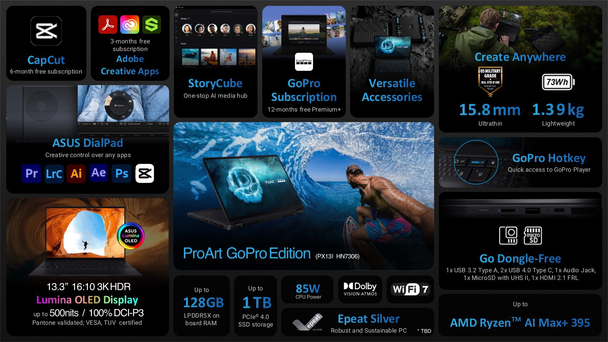 Jak się okazuje, ProArt GoPro Edition (PX13) jest jedną z trzech nowych jednostek SKU ProArt PX13 wprowadzonych na rynek w tym roku. Niestety, Asus nie potwierdził jeszcze cen ani dostępności. Zamiast tego firma wykorzystuje targi CES 2026, aby skupić się na tym, jak najnowszy ProArt PX13 różni się od swojego poprzednika pod względem technicznym.