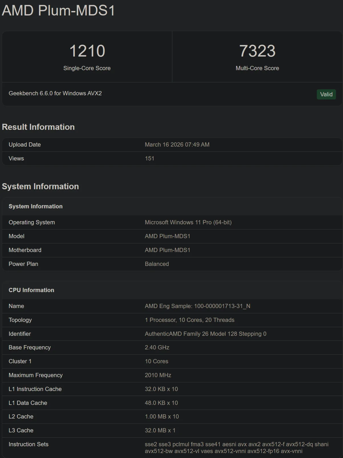 Uzyskał on odpowiednio 1210 i 7323 punktów w jedno- i wielordzeniowych testach Geekbench 6.6. Posiada on dziesięć rdzeni CPU i 32 MB pamięci podręcznej, co stanowi znaczące ulepszenie w stosunku do 24 MB oferowanych przez Gorgon Point. Ponieważ jest to próbka inżynieryjna, testowany tutaj Ryzen AI 9 565 nie działa z pełną wydajnością, o czym świadczy jego taktowanie boost wynoszące 2,3 GHz.