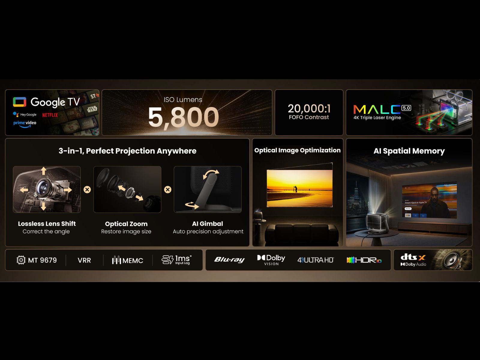 Dodatkowe inteligentne funkcje obejmują automatyczne dopasowanie ekranu, autofokus, unikanie przeszkód, adaptację kolorów ścian i mechanizmy ochrony oczu, wszystkie obsługiwane przez regulacje AI w czasie rzeczywistym. Projektor działa w oparciu o system Google i zawiera 4 GB pamięci RAM oraz 64 GB pamięci wewnętrznej.