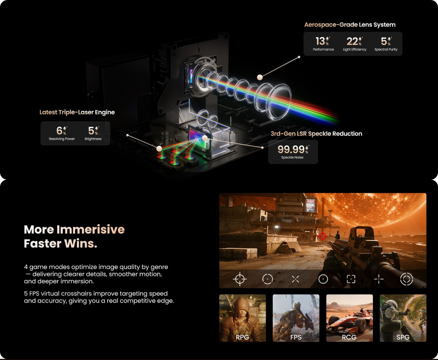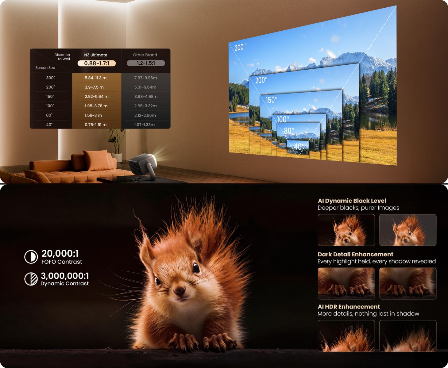 Jeśli chodzi o jakość obrazu, N3 Ultimate wykorzystuje trójlaserowe źródło światła i zapewnia rozdzielczość 4K z deklarowaną gamą kolorów 110% BT.2020 i Delta E około 0,7. Projektor charakteryzuje się również współczynnikiem kontrastu 20 000:1 i obsługuje Dolby Vision i HDR10, a także Dolby Audio i DTS-X dla wyjścia dźwięku.