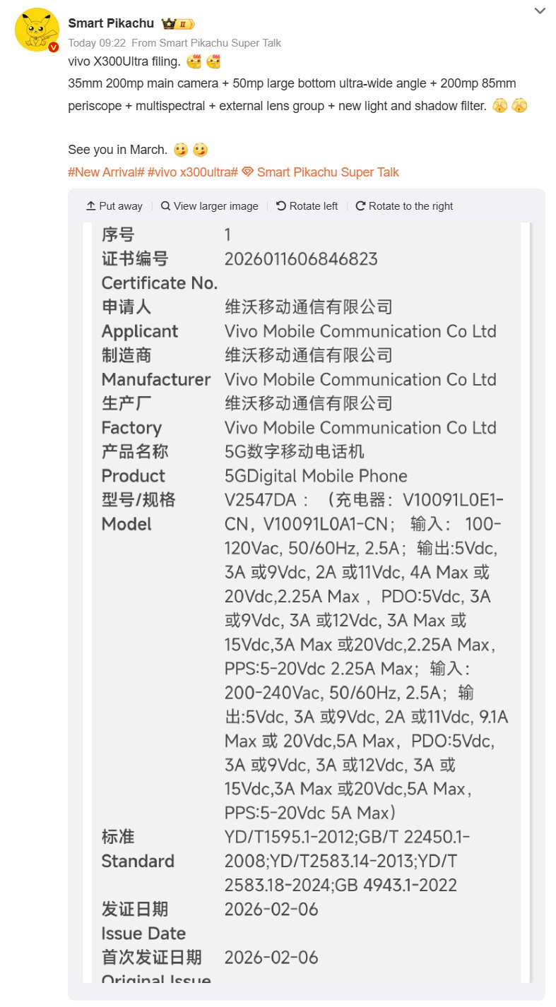Drugi wariant Vivo X300 Ultra, numer modelu V2547DA, niedawno zakończył standardowy proces certyfikacji w Chinach. Wariant ten różni się od zwykłego Vivo X300 Ultra przede wszystkim zintegrowanymi komponentami odbiornika satelitarnego. Bardziej intrygujące są jednak doniesienia z chińskich mediów o dedykowanej minikamerze opracowywanej obecnie przez Vivo, której premiera planowana jest na 2026 rok. Może to być kamera do vlogowania podobna do serii DJI Osmo Pocket, która jest również również jest aktualizowana w tym roku. Według raportu, zostało to nawet potwierdzone przez Vivo