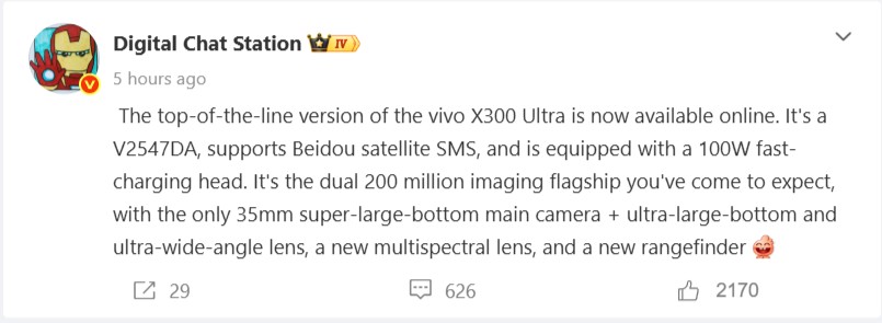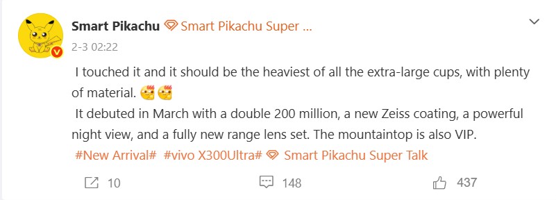 Znaczącą zaletą modelu Vivo X200 Ultra nad konkurentami był i nadal jest ultraszerokokątny aparat 1/1,28 cala. Funkcja ta prawdopodobnie zostanie jeszcze bardziej ulepszona w następcy modelu, jak niedawno wyjaśniła Digital Chat Station na Weibo. Oczekuje się, że w szczególności nagrania wideo skorzystają z najlepszego w branży ultraszerokiego kąta. Innym interesującym aspektem tego postu jest komentarz wspominający o Vivo X300 Max, który najwyraźniej zostanie wprowadzony na rynek w Chinach w tym samym czasie co Vivo X300 Ultra i prawdopodobnie będzie większy Vivo X300 z podobnymi funkcjami aparatu