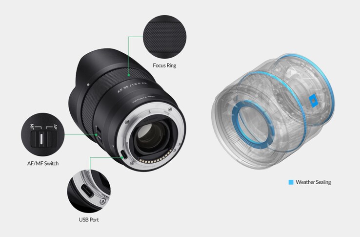 Dedykowany suwak umożliwia przełączanie między autofokusem a ręcznym ustawianiem ostrości. Obiektyw oferuje minimalną odległość ogniskowania wynoszącą 0,27 metra i gwint filtra o średnicy 62 milimetrów. Ponieważ Samyang nie może instalować aktualizacji oprogramowania układowego bezpośrednio przez aparat, producent zainstalował port USB-C w uchwycie, który może być używany do instalowania aktualizacji.